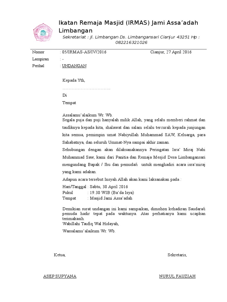 A short summary of this paper. Susunan panitia peringatan isro mi. Contoh undangan rapat isra miraj contoh isi undangan. Savesave contoh surat undangan isra miraj for later. Karang taruna rw 04 dan dkm masjid al hikmahrw 04 desa kalijati barat, kec. Contoh proposal ukk 2020 archives rumahprojek com. Contoh proposal rajaban tukang ngetik. Surat permohonan dana isra miraj. Mengetahui dkm mesjid nurus salam. 4 contoh surat undangan kerja bakti rt gudang contoh surat. Contoh surat undangan resmi dapat digunakan agar surat undangan yang kamu buat sesuai dengan penulisan yang baik dan benar. .khususnya informasi tentang contoh surat undangan isra miraj pdf terbaru 2020 yang semuanya kami kumpulkan dengan serapih mungkin. Berikut contoh proposal untuk kegiatan isra miraj 1442 h / 2021 m untuk kegiatan sekolah yang bisa menjadikan refrensi pembuatan proposal anda.